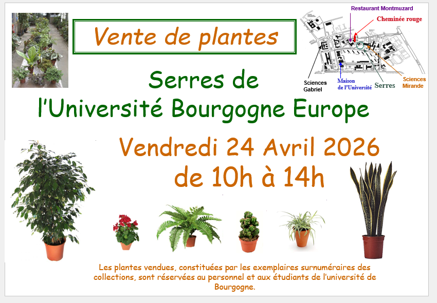 La prochaine vente de plantes des serres de l’Université Bourgogne Europe aura lieu vendredi 24 avril 2026 de 10h à 14h.