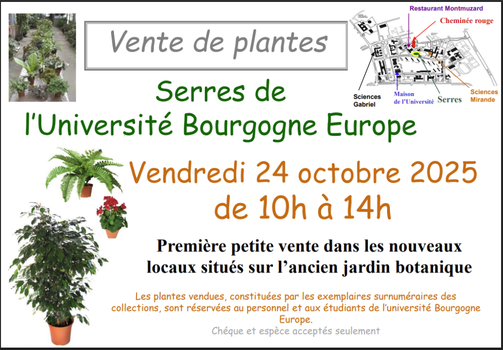 Vendredi 25 octobre 2013 de 10h00 à 15h00 Les plantes vendues, constituées par les exemplaires surnuméraires des collections, sont réservées au personnel et aux étudiants de l’université de Bourgogne. Site des serres…